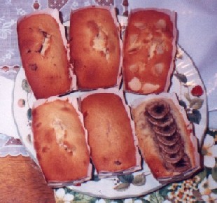 Separate the dough in 5-6 small bolws and mix your choice of topping to each. Put them in small pound pans and bake about 20-25 minutes. Stick a tiny stick to see if it's done.