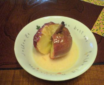 1.りんごの芯を抜き、砂糖(各大さじ1)、シナモン、バターを中にいれる。少し深い耐熱皿にりんごを並べる。