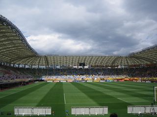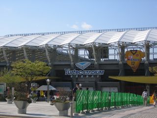 屋根のせいで歓声が反響し、熱いことで有名なベガルタ、レッズの